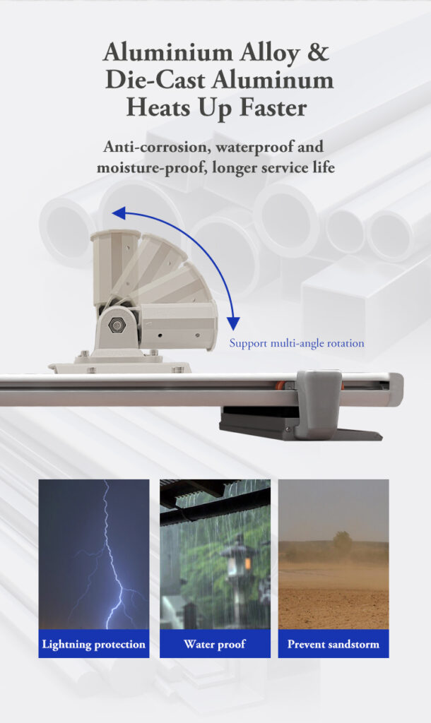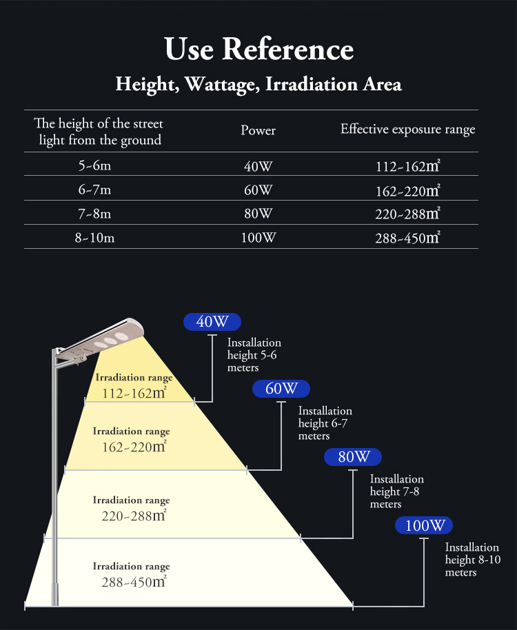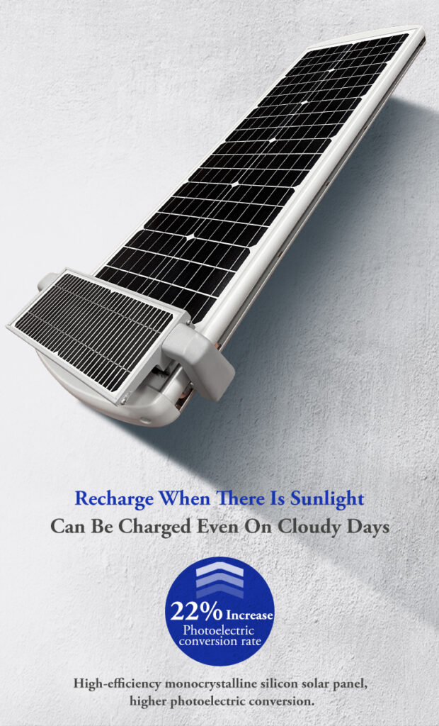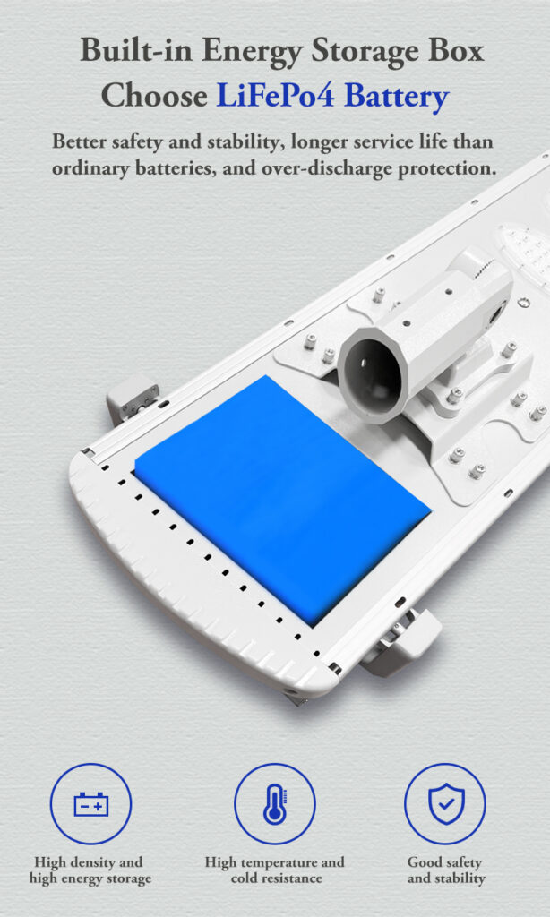 1. High quality LifePO4 battery, more than 2000 cycles. 2. Use brand-new 5050 high luminous efficiency lamp beads, excellent lumen value, high brightness, no fading spots, uniform illumination, and long service life. 3. Long rainy lasting days for 3-5 rainy days. 4. Light Control + Time control. 5. ALS to achieve all night lighting when weather change. 6. TCS to protect the battery charging and discharging in high temperature. 7. Bluetooth app mobile control function available. 8. Applications: Garden/ Park/ Street / Highway/ Parking Lot/Sidewalk/Square.