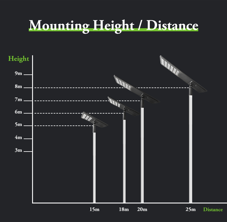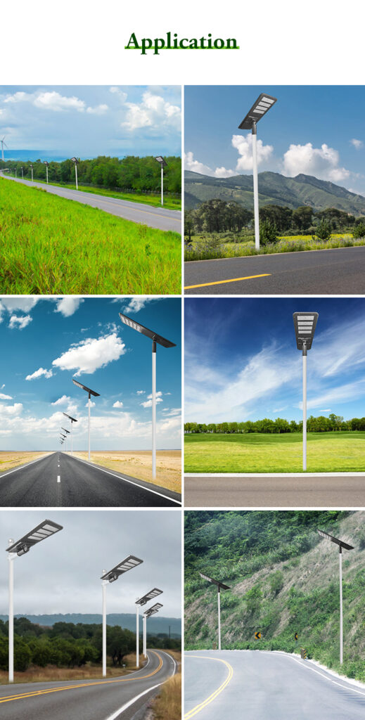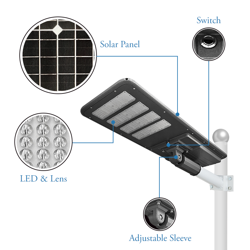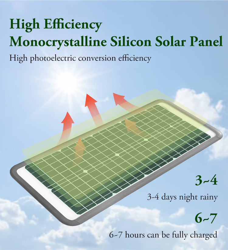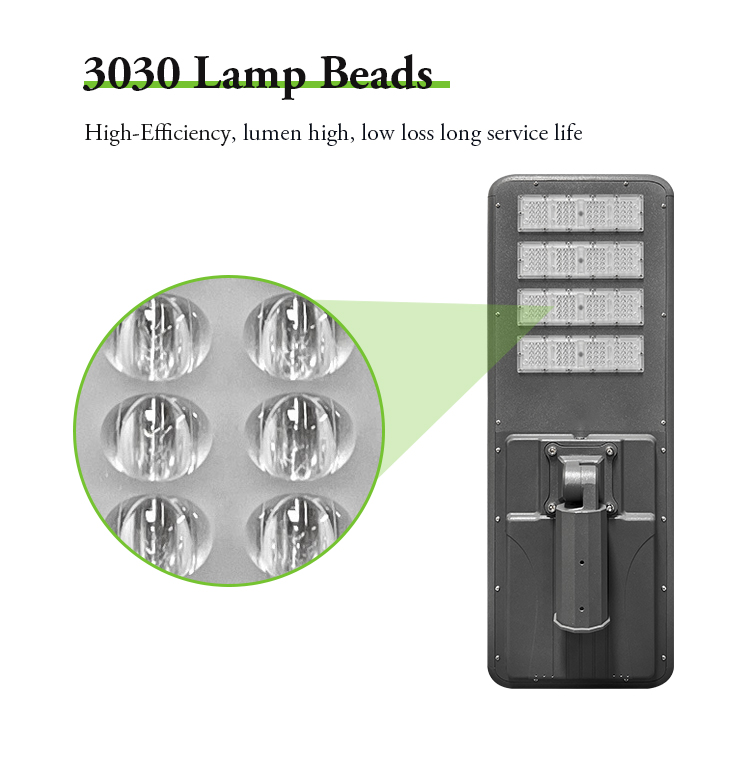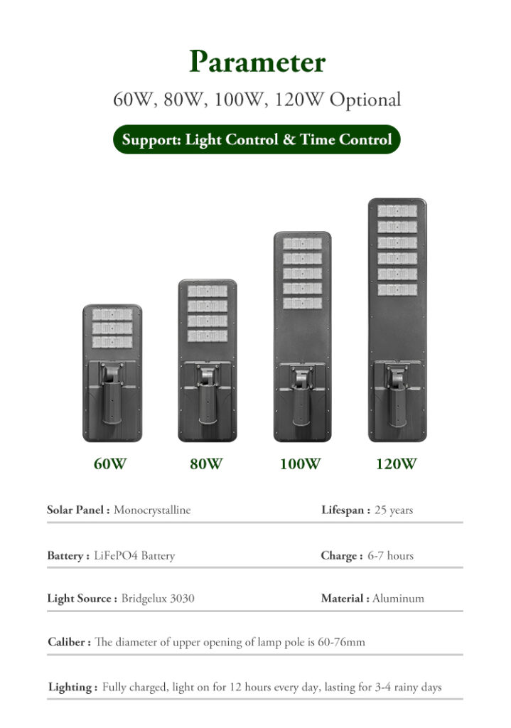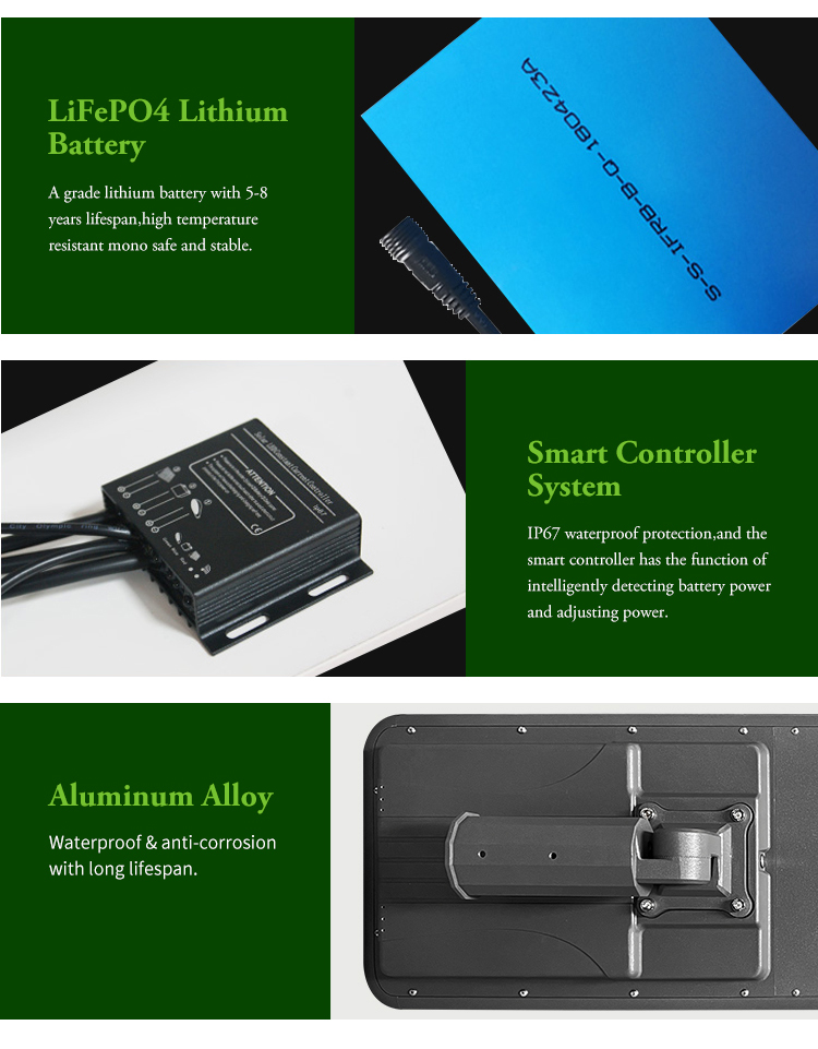 1. High quality LifePO4 battery, more than 2000 cycles. 2. Use brand-new 3030 high luminous efficiency lamp beads, excellent lumen value, high brightness, no fading spots, uniform illumination, and long service life. 3. Long rainy lasting days for 3-5 rainy days. 4. Light Control + Time control. 5. ALS to achieve all night lighting when weather change. 6. TCS to protect the battery charging and discharging in high temperature. 7. Bluetooth app mobile control function available. 8. Applications: Garden/ Park/ Street / Highway/ Parking Lot/Sidewalk/Square.